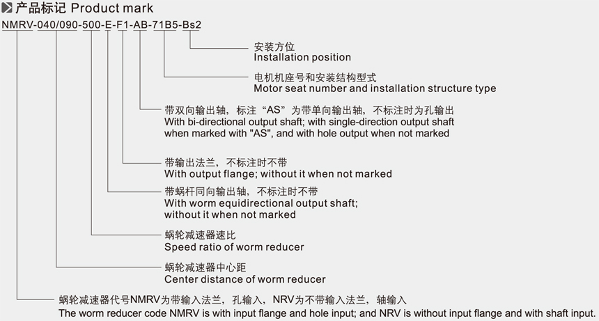NMRV-蝸輪減速機(jī)代號(hào)NMRV為帶輸入法蘭,孔輸入,NRV為不帶輸入法蘭,軸輸入